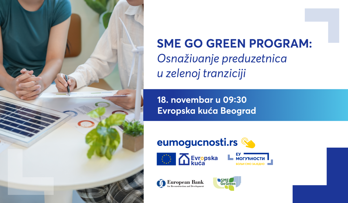Radionica „SME Go Green“, koju organizuje Evropska banka za obnovu i razvoj (EBRD) u saradnji sa Evropskom kućom u Beogradu, posvećena je razvoju i podršci malim i srednjim preduzećima kojima upravljaju žene, sa posebnim akcentom na mogućnostima finansiranja zelenih investicija i uvođenju održivih poslovnih modela.